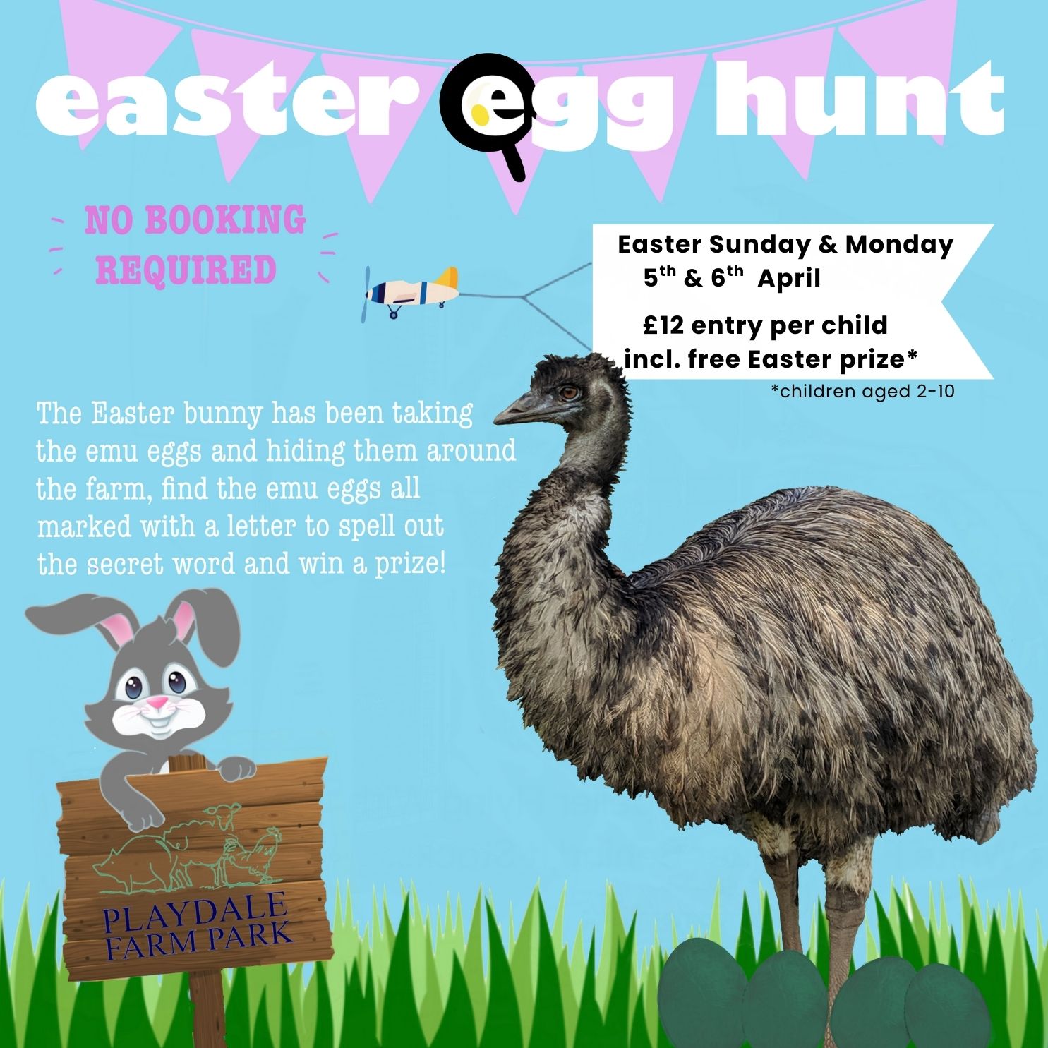 Join us on Easter Sunday & Monday for our egg hunt! On your way around the farm keep your eyes peeled as the Easter Bunny has been out and about hiding emu eggs with some of the animals. There is a letter on the side of each egg, unscramble the letters to spell out the secret farm word. Once you’ve figured out the secret word, give your answer to the person in the shop for a special Easter gift!